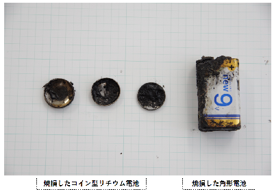 令和4年2月、使用済みであるコイン型リチウム電池や角型電池の保管方法が不良であったために、火災に至ったと推定される事案が発生しました。