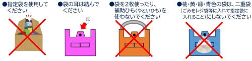 ○指定袋を2枚使ったり、補助ひも(やといひも)を使わないでください。