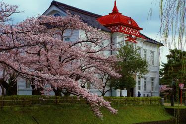 鶴岡地区で使用されているマンホール蓋には日本の桜100選に選ばれている鶴岡公園内にある「大宝館」、市の花である「さくら」、市章の「鶴」がデ ザインされています。